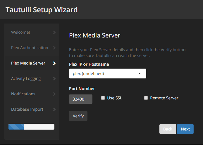 Verify. When you see the "Server found!" message, clickNext. - "Plex IP or Hostname":
