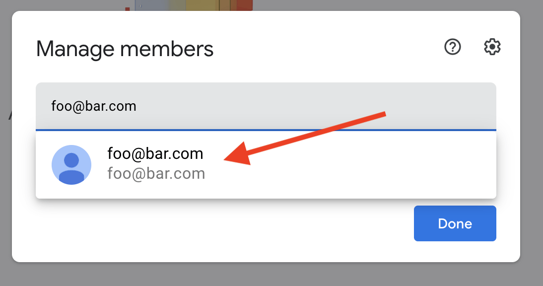 2. Enter the email address of the individual, service account, or group, and click on the name in the menu that appears.