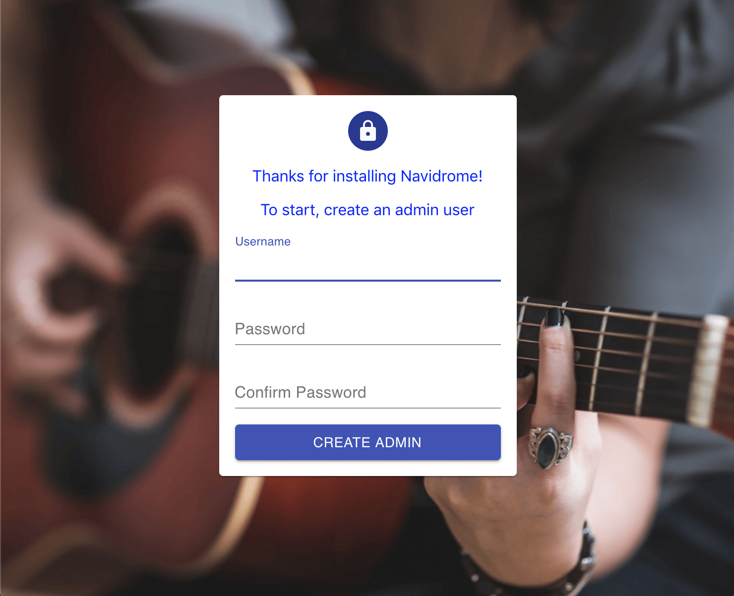 • After installing Navidrome in your platform, you need to create your first user. This will be your admin user, a super user that can manage all aspects of Navidrome, including the ability to manage other users. Just browse to Navidrome’s homepage at https://navidrome.iYOUR_DOMAIN_NAMEi and you will be greeted with a screen like this: